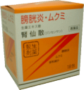 | 排尿の後の強い痛み、15種の生薬が膀胱炎・ムクミを和らげます。【第2類医薬品】腎仙散(12包入り) 価格: 1,350円  レビュー評価:0.0  レビュー数:0  医薬品は使用上の注意をよく読み、用法・容量を守って正しくお使い下さい。 第2類医薬品販売について 6月1日より離島居住者又は継続使用者のみへの販売です また、販売にあたりましては購入者の販売記録を作成いたします  <用法・用量に関する注意>(1)用法・用量を厳守してください。(2)小児に服用させる場合には、  保護者の指導監督のもとに服用させてください。使用上の注意相談すること1.次の人は服用前に医師または薬剤師に相談してください。●医師の治療を受けている人●妊婦または妊娠していると思われる人●胃腸の弱い人●本人または家族がアレルギー体質の人 ●薬によりアレルギー症状を起こしたことがある人 Supported by 楽天ウェブサービス | 腎盂炎・膀胱炎・ムクミに!腎仙散(ジンセンサン)93包 【第2類医薬品】 価格: 10,080円  レビュー評価:0.0  レビュー数:0  ■ 商品説明 ■【特徴】腎仙散(ジンセンサン)は、利尿作用のほか、抗炎症作用を有する生薬を配合しており、腎臓の老廃物排泄を促進するとともに、排泄障害や炎症性の疾患にも効果を発揮します。服用しやすい、携帯に便利なアルミ分包包装です。 【効能・効果】 腎炎・ネフローゼ・腎盂炎・膀胱炎・ムクミ・尿利減少 【用法・用量】 成人 1回1包  8歳?15歳 1回1/2包  4歳?7歳 1回1/3包  1日3回・食間に服用してください。【成分・分量】 1包1.5g・20包中下記生薬より製したエキス25.0g含有  タクシャ   6.0g   ジオウ   6.0g  チョレイ   6.0g   ボウイ   Supported by 楽天ウェブサービス |  |
